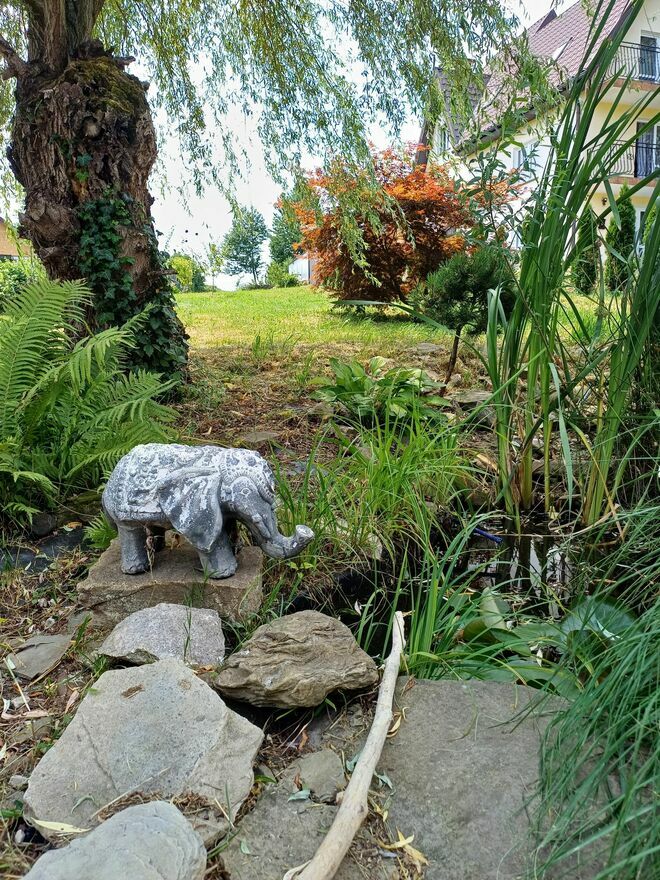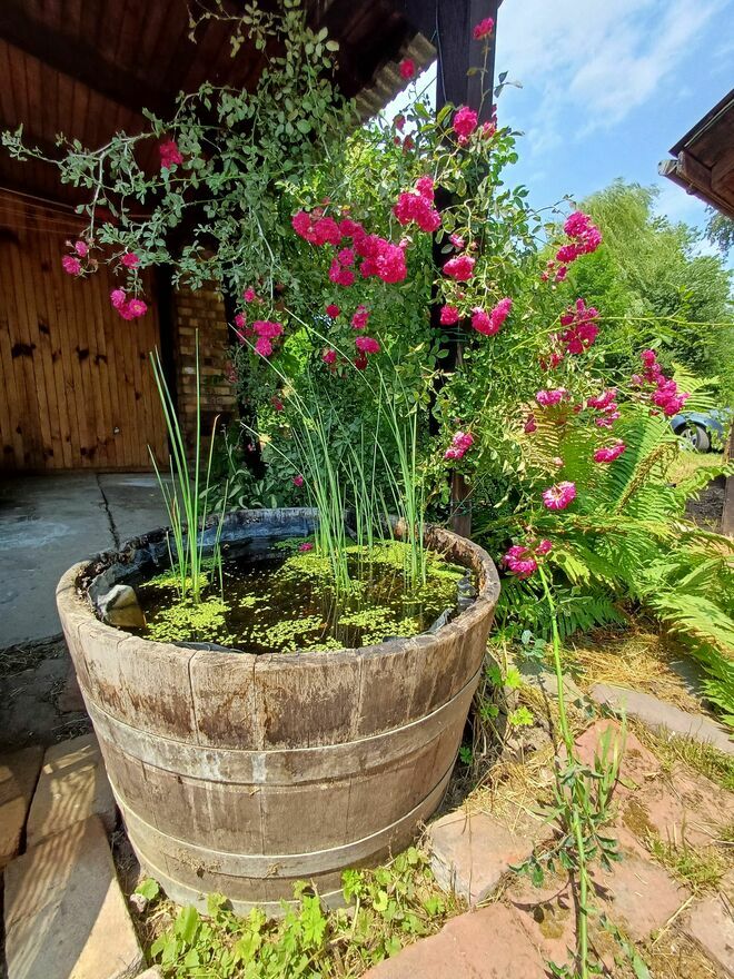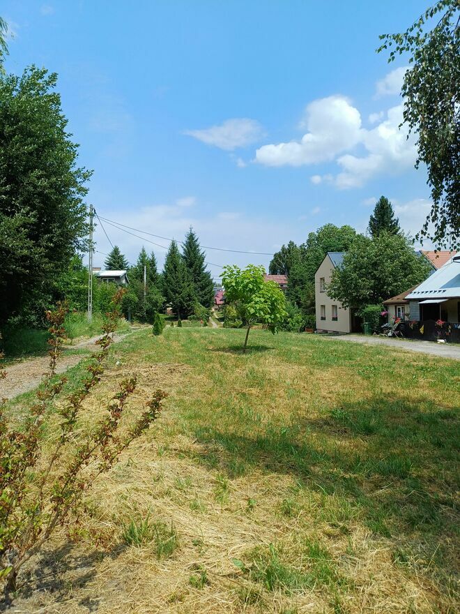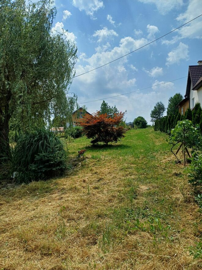 Dodatkowo na działce znajduje się drewniany składzik, kompostownik, niewielkie oczko wodne, oraz nasadzenia ozdobne i owocowe.