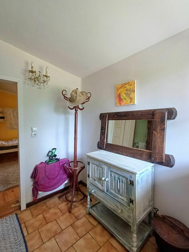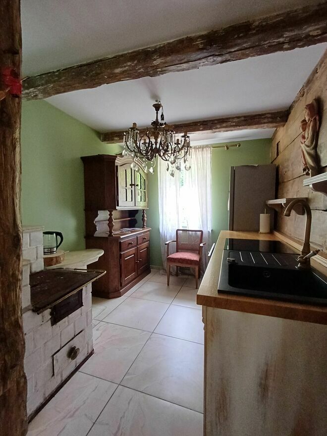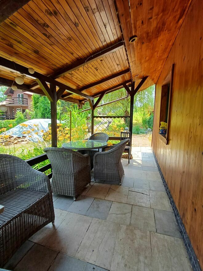 Dom o powierzchni użytkowej ok. 60,00 m2, na którą składa pokój dzienny ze stylowym kominkiem, sypialnia, pokój, kuchnia z piecem kaflowym, łazienka, przedpokój i wiatrołap. Ponadto w budynku znajduje się kotłownia ze składem na opał, a przy ścianie budynku zadaszony taras rekreacyjny.