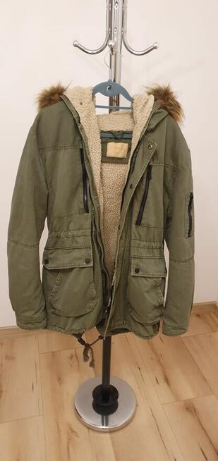 Witam, sprzedam ciepła kurtkę zimową, stan jak na zdjęciach, jedyna wada to brak suwaka w lewej kieszeni(jest zszyty).