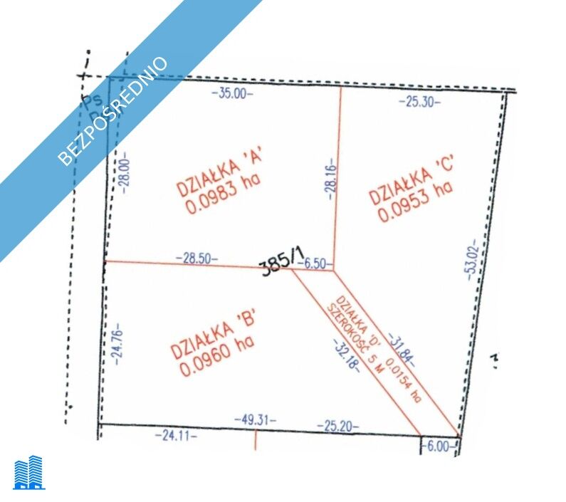 Na działce możliwa jest budowa domu, ale możliwy jest także jej podział na trzy mniejsze działki i budowa niezależnego obiektu na każdej z nich z osobna. W tym celu dokonano już wstępnej koncepcji podziału, którą załączono do ogłoszenia i wystąpiono o warunki zabudowy, które otrzymano (trzy sztuki). Uwaga, ww. podział nie jest jeszcze podziałem geodezyjnym, i do niczego jeszcze nie zobowiązuje, a pokazuje jedynie różne możliwości zagospodarowania terenu. Zgodnie z ww. WZ – tami, na każdej z trzech działek (lub w przypadku, gdyby przyszły właściciel nie był zainteresowany podziałem i chciał zagospodarować działkę w całości tak, jak wygląda ona w tej chwili) możliwa jest budowa obiektu/obiektów o następujących parametrach (zapisy z warunków zabudowy):